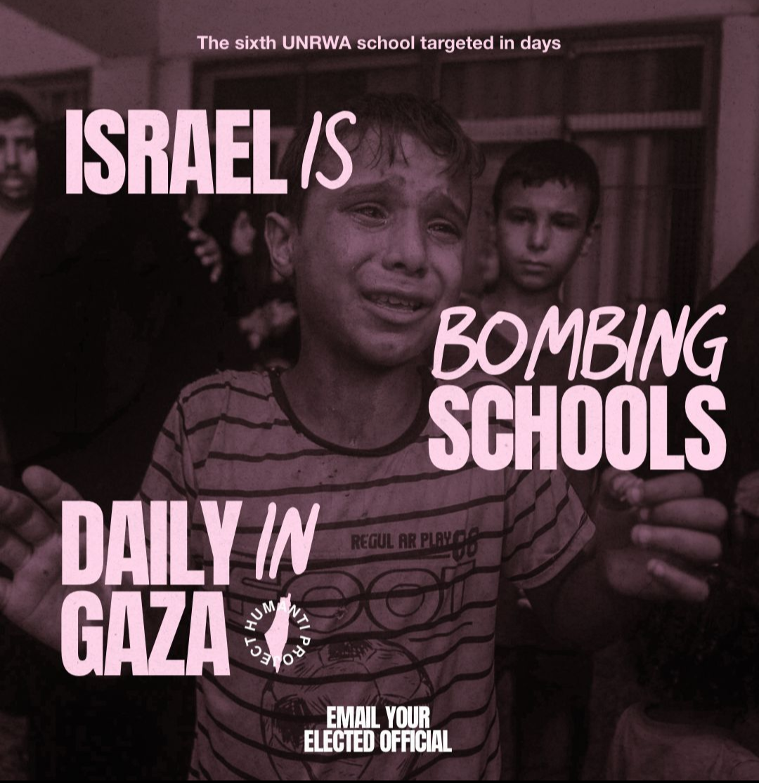 I am writing to you with an urgent plea for immediate action regarding the ongoing targeted bombings of Gaza’s schools by Israeli forces. These facilities, including UNRWA schools, are currently sheltering thousands of displaced Palestinians. Nowhere is safe, and American weapons are being used in these attacks. There must be an immediate arms embargo, an urgent unconditional ceasefire, and sanctions implemented to enforce this ceasefire.