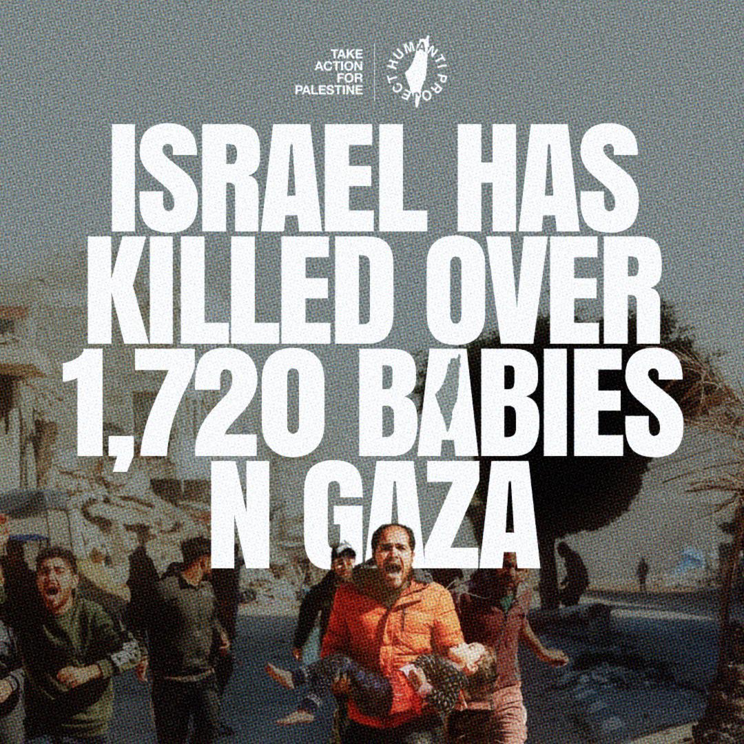 Israel has killed at least 17,400 children in Gaza, including 1,720 babies under the age of 2. A child is killed by Israel every 45 minutes.
